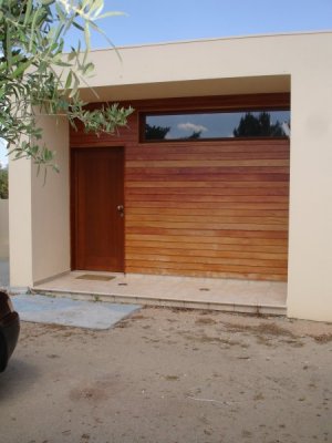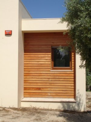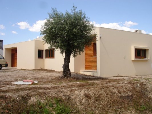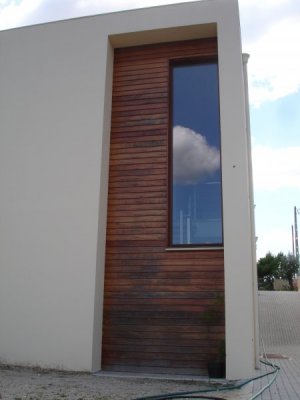 Construção contemporânea particularizada pela forra exterior e caixilharia de madeira de afzélia.