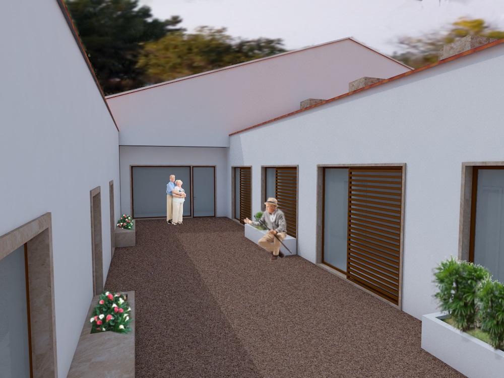 O espaço exterior dispõe de zonas verdes e protegidas, com bancos e áreas de descanso com sombra, contribuindo assim para o bem-estar físico e psicológico dos utentes.