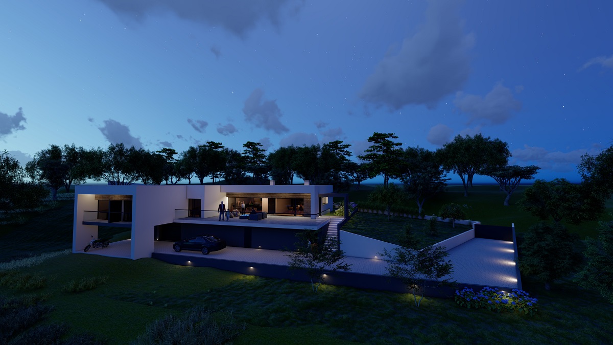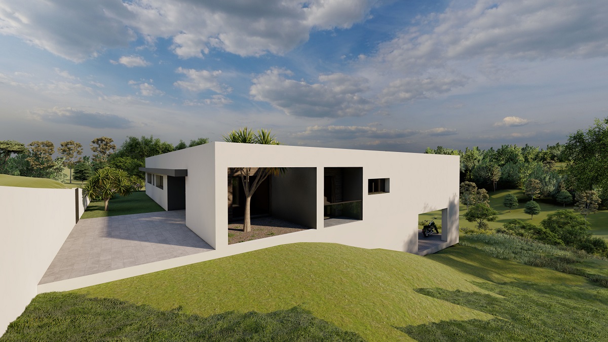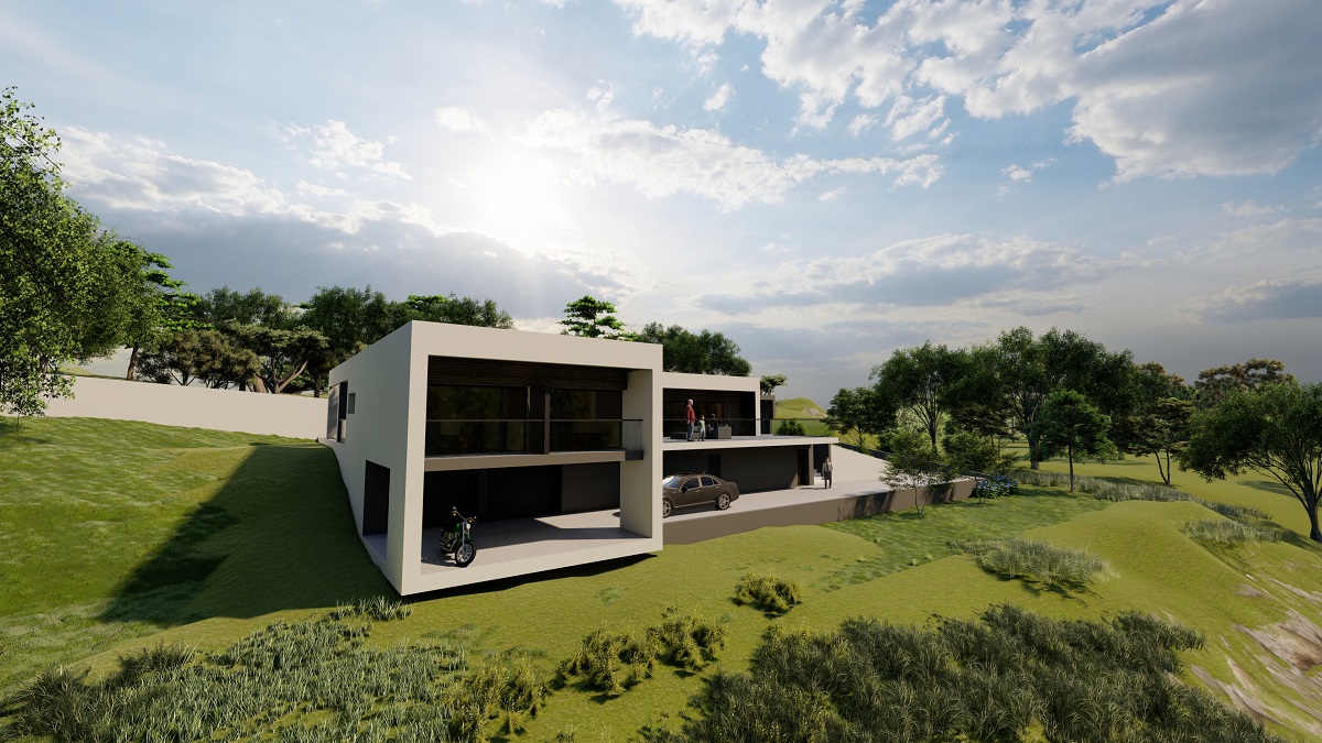 O projecto de arquitectura teve como premissa uma habitação em dois pisos que colmate o desnível do terreno.