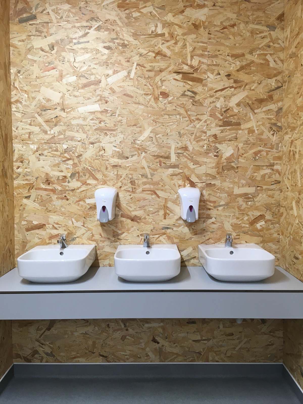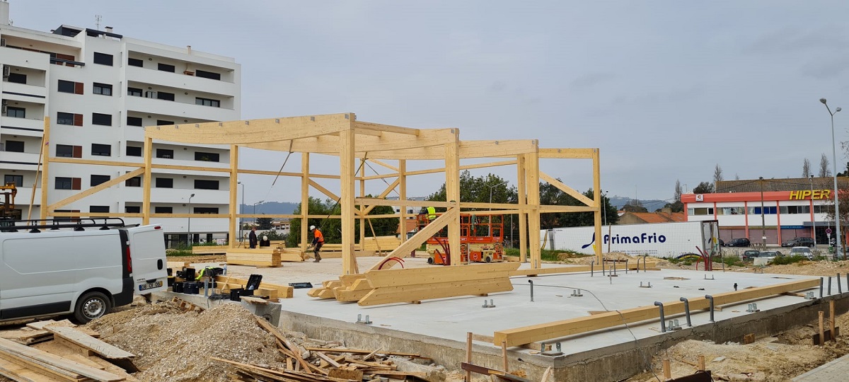 A madeira é assumida como material estrutural e de acabamentos totalmente à vista pelo interior, e revestida pelo exterior com painéis viroc cinza bruto e forro de madeira nas zonas da fachada abrigadas das intempéries.