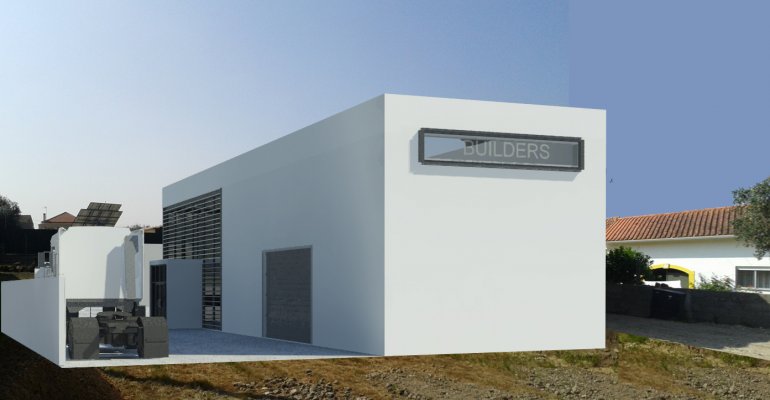 A proposta para a construção do pavilhão industrial destinado a armazém e escritórios procura a simplicidade volumétrica de um paralelepípedo branco, cujo canto rasgado em amplos vãos sombreados com lâminas metálicas busca a luz ideal.