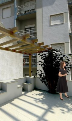 Ao nível do primeiro andar conta com um terraço ladeado com namoradeiras e pérgolas que transparecem um ar de quintinha.